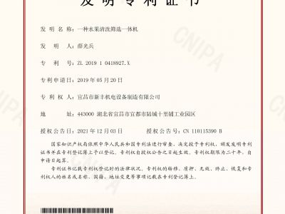 實(shí)用新型專(zhuān)利證書(shū)《一種環(huán)形加工的水果分選機(jī)》
