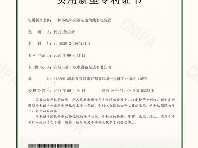 實(shí)用新型專(zhuān)利證書(shū)《一種多級(jí)料果篩選滾筒線驅(qū)動(dòng)裝置》