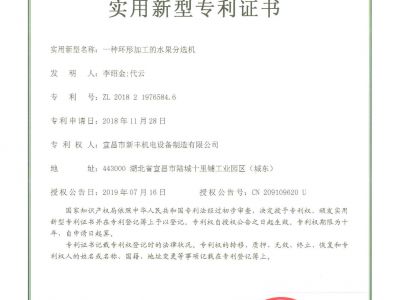 實(shí)用新型專(zhuān)利證書(shū)《一種環(huán)形分級(jí)機(jī)》